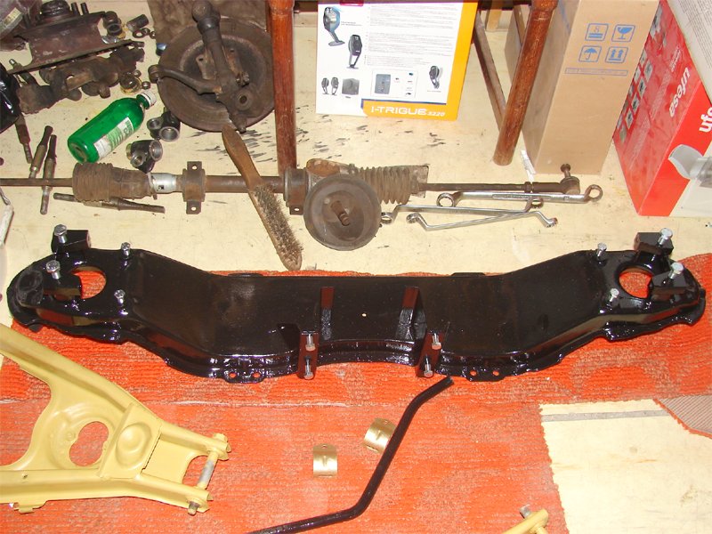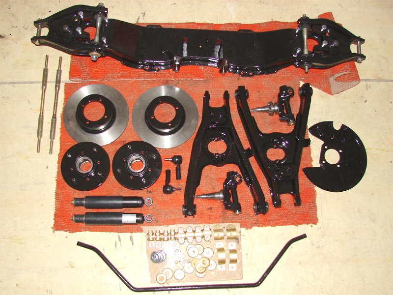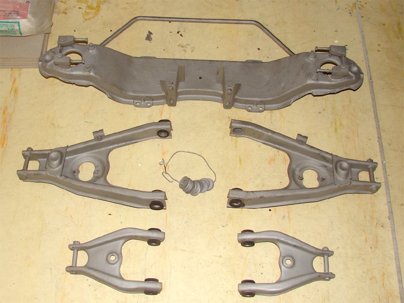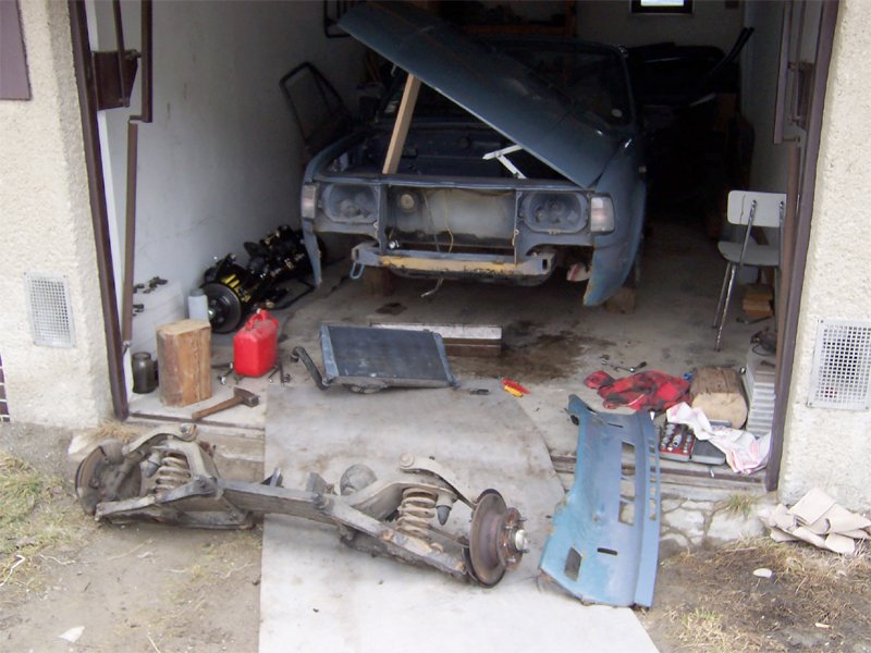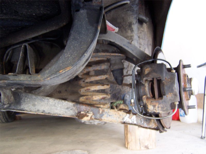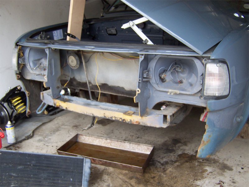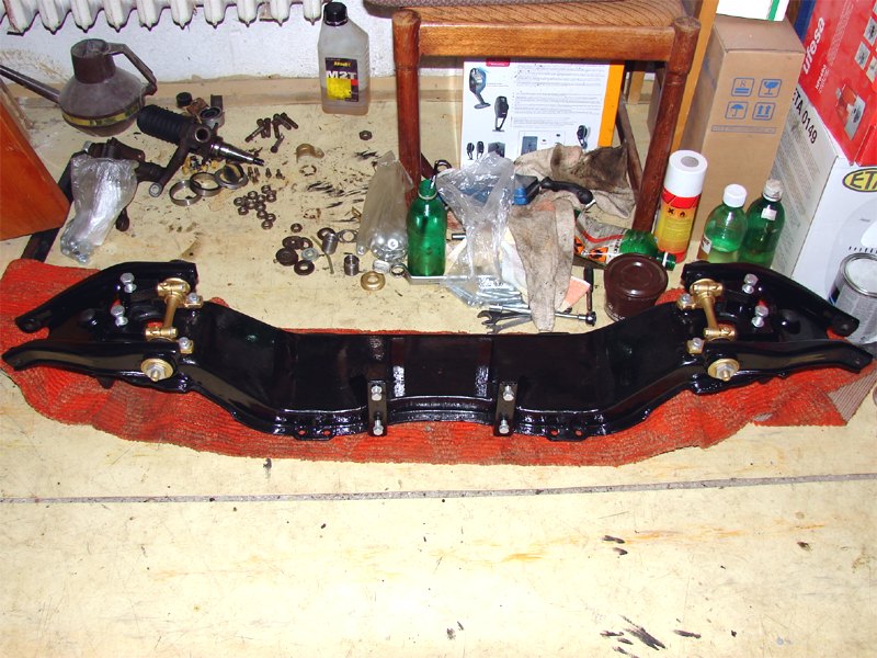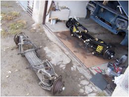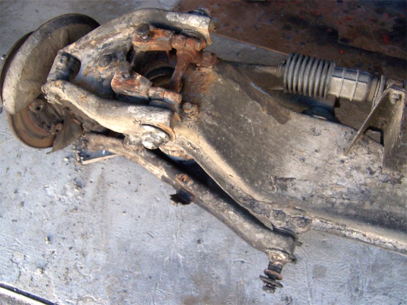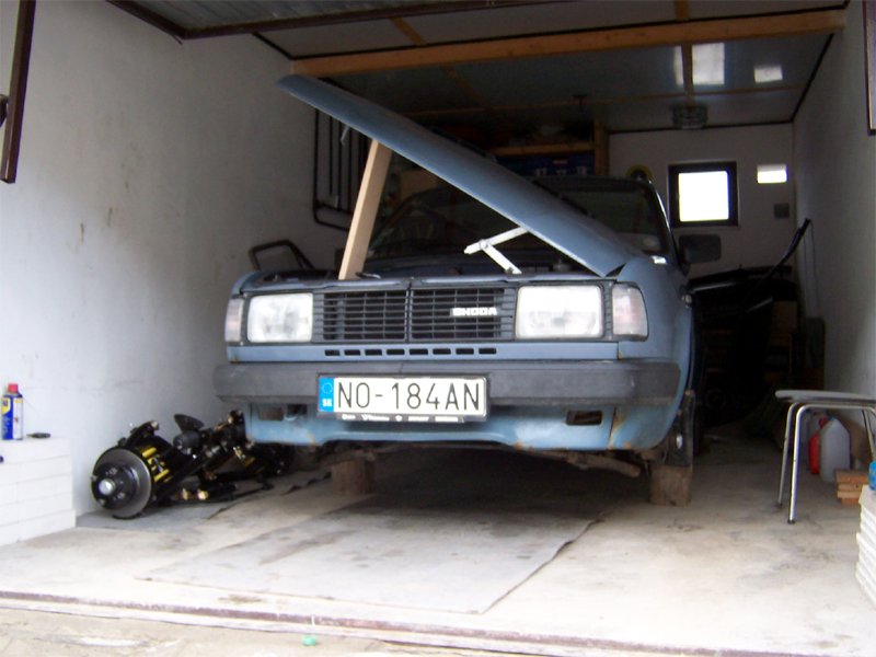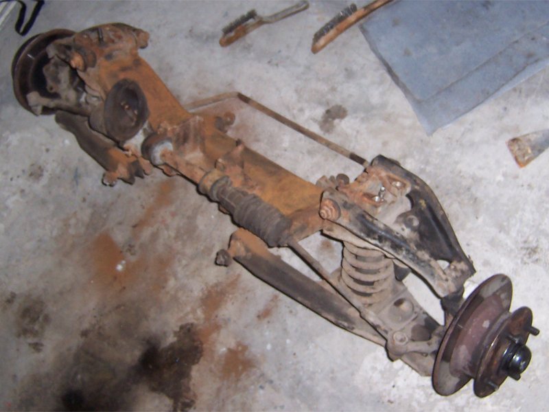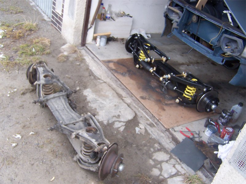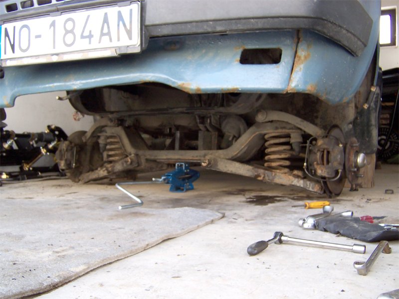 ......................................................................................................................................................................................... Skladanie nápravy (01.12.2007 - 19.02.2008): Kompletizácia ramien, posledné povrchové úpravy, nákup neštandardného spojovacieho materiálu, skladanie nápravy. ......................................................................................................................................................................................... Demontáž starej nápravy (03.03.2008): ...a predtým demontáž všetkého, čo nápravu v aute držalo :) ......................................................................................................................................................................................... Ošetrenie častí auta (08.03.2008 - 13.03.2008): Oškrabanie starých náterov kde nedržali + očistenie, náter základnou farbou + 2 x čierne Body 930, vystriekanie všetkých dutín karosérie prednej časti prípravkom Resistin ML.