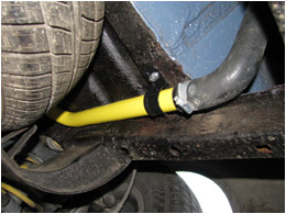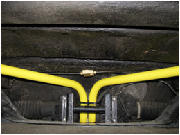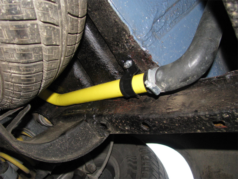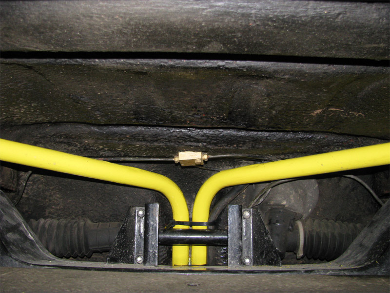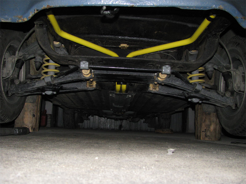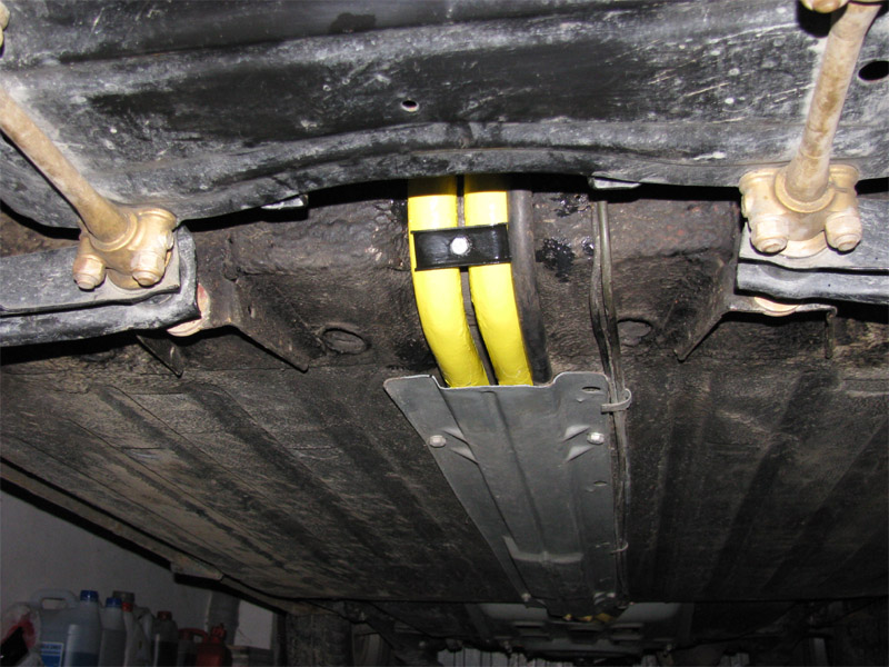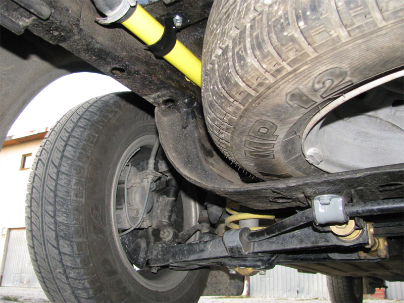 2009.10.13 - náter predných vodných trubiek, náter držiakov predných tlmičov + úpravy Pre náter predných vodných trubiek na žlto som sa rozhodol pre jediný dôvod: Pri renovácii zadnej nápravy a zadnej časti podvozku auta pred rokom som zadné vodné trubky po opieskovaní natrel žltou farbou a predné boli doteraz zapatlané celé aj spolu s držiakmi čiernym Bodyčkom....Tak som to chcel trochu farebne zjednotiť. Ináč by som už tie trubky ale na žlto nikdy nenatieral, keby už zadné neboli žlté, teraz by som to radšej celé natrel inou farbou....šedou....Snáď niekedy pri ďalšej renovácii auta :)) Na týchto fotkách vyzerajú tie žlté trubky dosť odstrašujúco, to je pravda :) V skutočnosti bez osĺnenia bleskom foťáku je to ale o niečo lepšie....A keď sa to zašpiní ako zvyšok podvozku tak to bude úplne super :)) Taktiež som pri tejto činnosti zrenovoval všetky držiaky predných vodných trubiek, očistené, obrúsené, a náter 2x základ a 2x čierny Alkyton + nové skrutky a matice. Zároveň som opravil ochranný náter spodných držiakov predných tlmičov, Alkyton v zlatom prevedení už bol mierne zošúpaný. Tentoraz som použil po obrúsení a natrení základnou farbou lesklý šedý Alkyton.