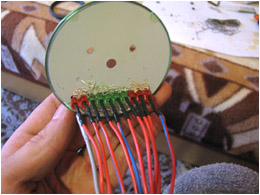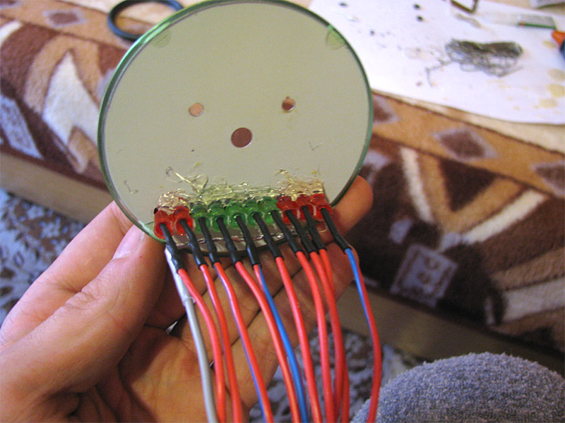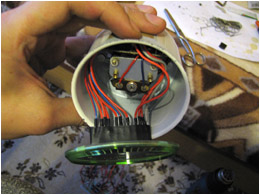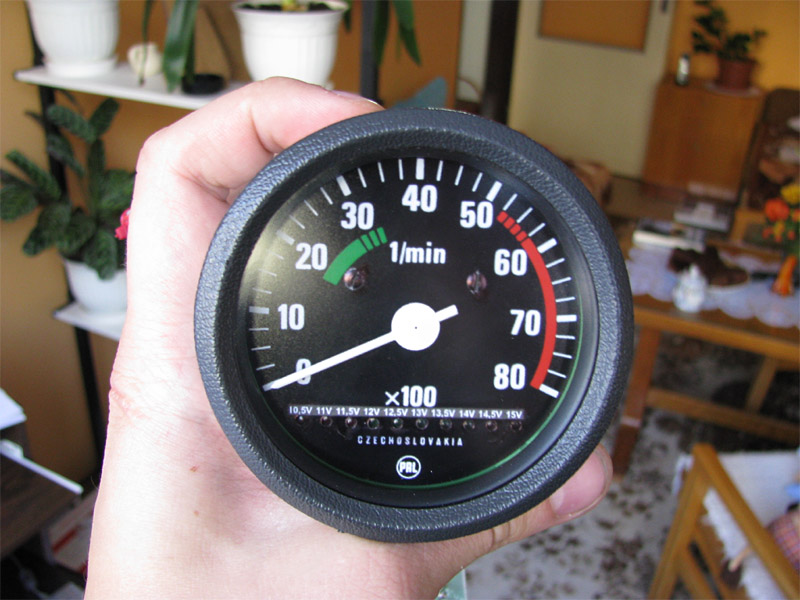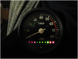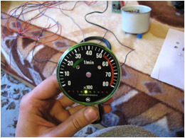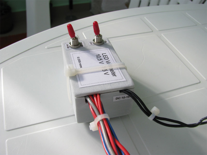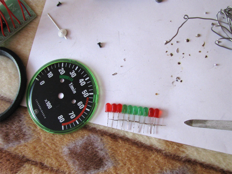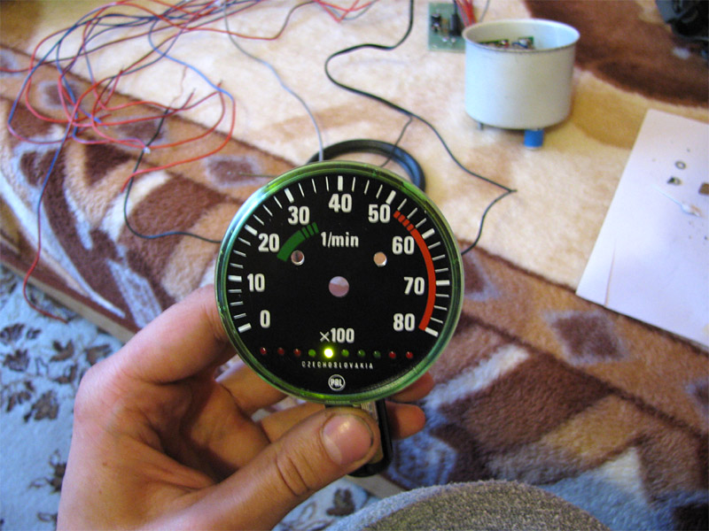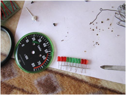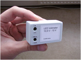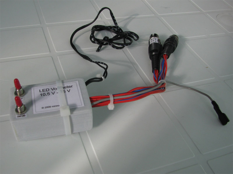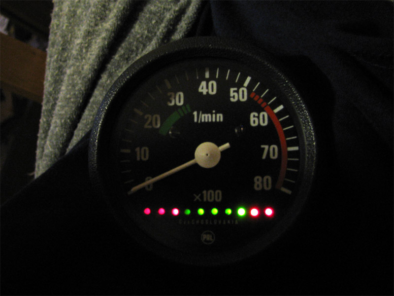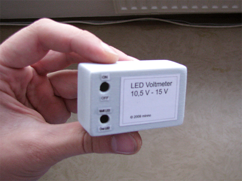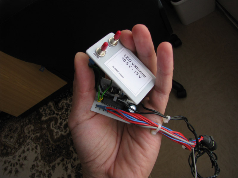2009.09.26 - Výroba LED Voltmetra a jeho zabudovanie do telesa otáčkomera Informácia o stave palubnej siete je celkom podstatný údaj. Byť informovaný o stave dobíjania akumulátora, hlavne na dlhých cestách, je dobrá vec, a preto som si aj ja spravil Voltmeter z LED diód a zakomponoval ho do budíku otáčkomera. Elektronika je založená na integrovanom obvode LM3914, ktorý je na takúto funkčnosť aj navrhovaný... Krokuje prepínanie výstupného napätia na svojich svorkách v rozmedzí po 0,5 V... Schéma zapojenia je použitá zo stránky http://pandatron.cz/?609&inikator_napeti_oloveneho_akumulatoru Káblový zväzok vedúci od otáčkomera je od jednotky voltmetra odpojiteľný konektormi. Vlastná výroba krabičky jednotky s dvoma spínačmi - ON/OFF a prepínač spôsobu zobrazovania napätia - buď svieti len jedna LED alebo celý stĺpec LED po patričné napätie.