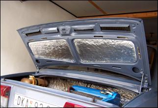 Najprv zrobíme jednu polovicu, potom druhú. Bežný Alobal je z jednej strany lesklý a z druhej strany matný (menej lesklý). Na plochu kapoty a na plochu lesklej strany Alobalu nanesieme Chemoprén, ktorý necháme cca na 10 min. odvetrať (v prípade použitia iného lepidla sa postup lepenia môže líšiť). Potom Alobal postupne prikladáme a prilepujeme na odhlučňovací materiál, až kým ho neprilepíme celý (pozor treba dať na prípadne "bubliny" a na to, aby nám po stranách mimo odhluč. materiál zostalo dosť voľného Alobalu). Posledným úkonom je pozakladanie zvyšného Alobalu po stranách pod plech kapoty (odporúčam robiť to pomaly a s citom, aby sa nám Alobal nepretrhol). Tým je "skrášľovanie" hotové. Výsledok by mal byť takýto: