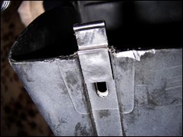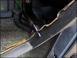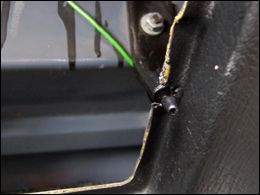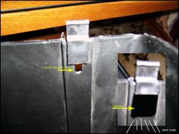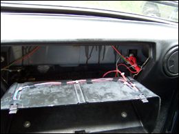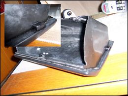 Tlačidlo som do palubnej dosky pripevnil prilepením cez plastovú podložku obdĺžnikového tvaru na upevňovací plechový držiak palubovky, obr. 2, 3. Pre spínací čudlík treba vypíliť malý zárez. Na miesto na priehradke kde bude doliehať tlačidlo treba podľa situácie vyrobiť a nalepiť oterovú doštičku (záleží od dĺžky čudlíka na tlačidle), obr. 4. Ako osvetľovací člen som sa rozhodol použiť dve biele vysokosvietivé LED diódy priemeru 2,5 mm. S ich umiestnením som mal menší problém, ale nakoniec sa mi jedna skvelá možnosť ponúkla sama :-) Na rohoch zadnej steny priehradky sú nasunuté dve zarážky, ktoré obmedzujú maximálnu polohu vyklopenia priehradky smerom von. A pod nimi sa nachádzajú priam ideálne dierky (obr. 5) :-) (pozn. na starších typoch bývajú tieto zarážky plechové, neviem, ako je to s tými dierkami tam).