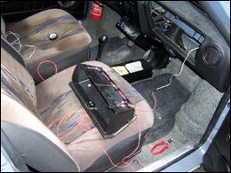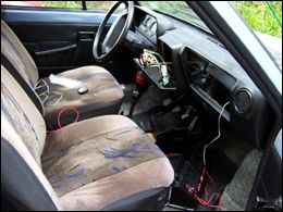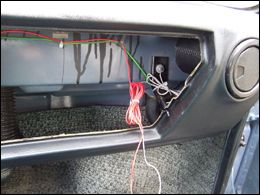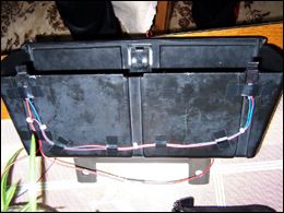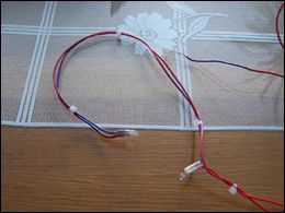 LED diódy som zapojil do série a keďže v aute je napätie 12-14V, celkový prúd prechádzajúci do LED som obmedzil rezistorom (hodnotu si už nepamätám, no myslím že to bolo 680 ohm). Zapojenie diód viď obr. 6. Umiestnenie diód na priehradke viď. obr 7. Káble som zozadu najskôr upevnil izolačnou páskou, onedlho som to však upravil a káble prilepil sekundovým lepidlom. Rovnako som prilepil aj LED, ktoré je aj tak potrebné zozadu prelepiť čiernou páskou, aby svetlo neunikalo tam kde nechceme.